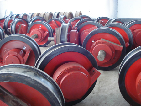 起重機車輪組的組成材料一般是優質的鑄鋼,因為車輪一般的損壞方式是磨損,點蝕和硬化層壓碎,所以為了增加車輪表面的耐磨度和使用壽命,一般使用比較堅硬和淬火深度比較大的材料。更多資訊盡在http://www.whjkjd.com/news/57.html